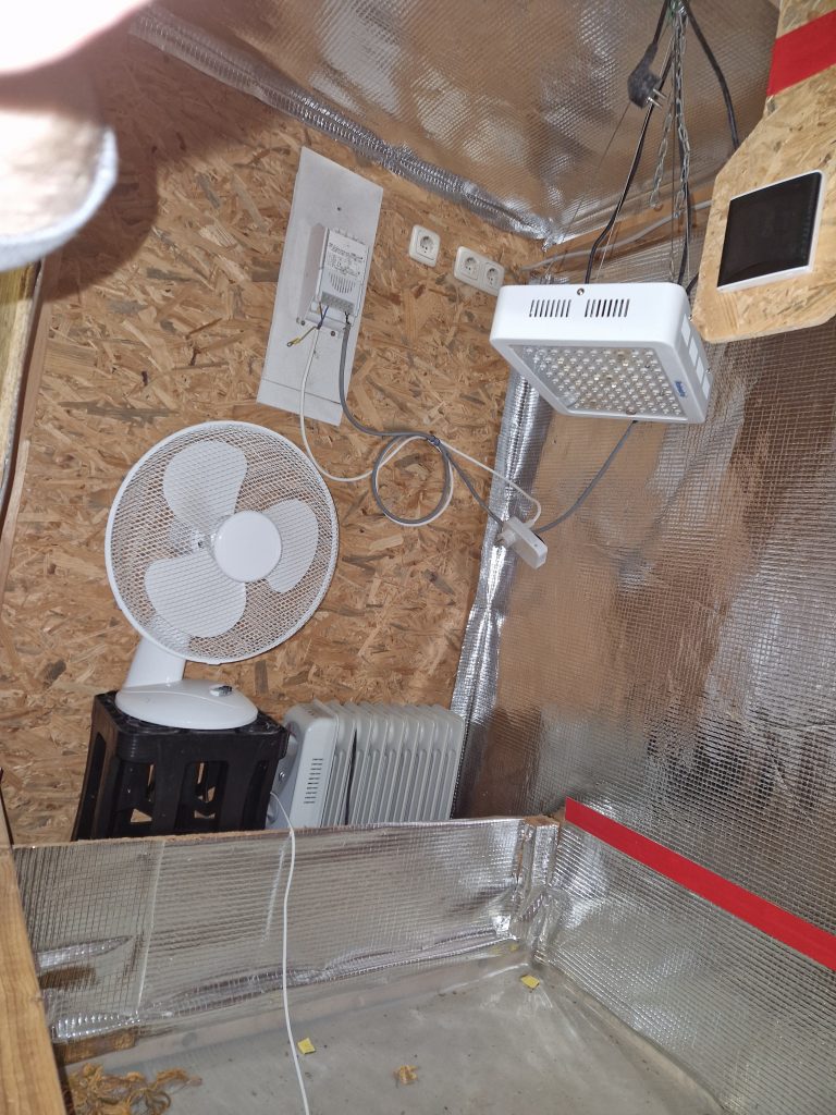 Beleuchtet wurde die Box mit einer 400-Watt-Natriumdampflampe und zeitweise auch mit einer LED-Lampe. Für die Temperaturregelung kam ein 2 kW Ölradiator, der über ein externes Thermostat gesteuert wurde zum Einsatz.