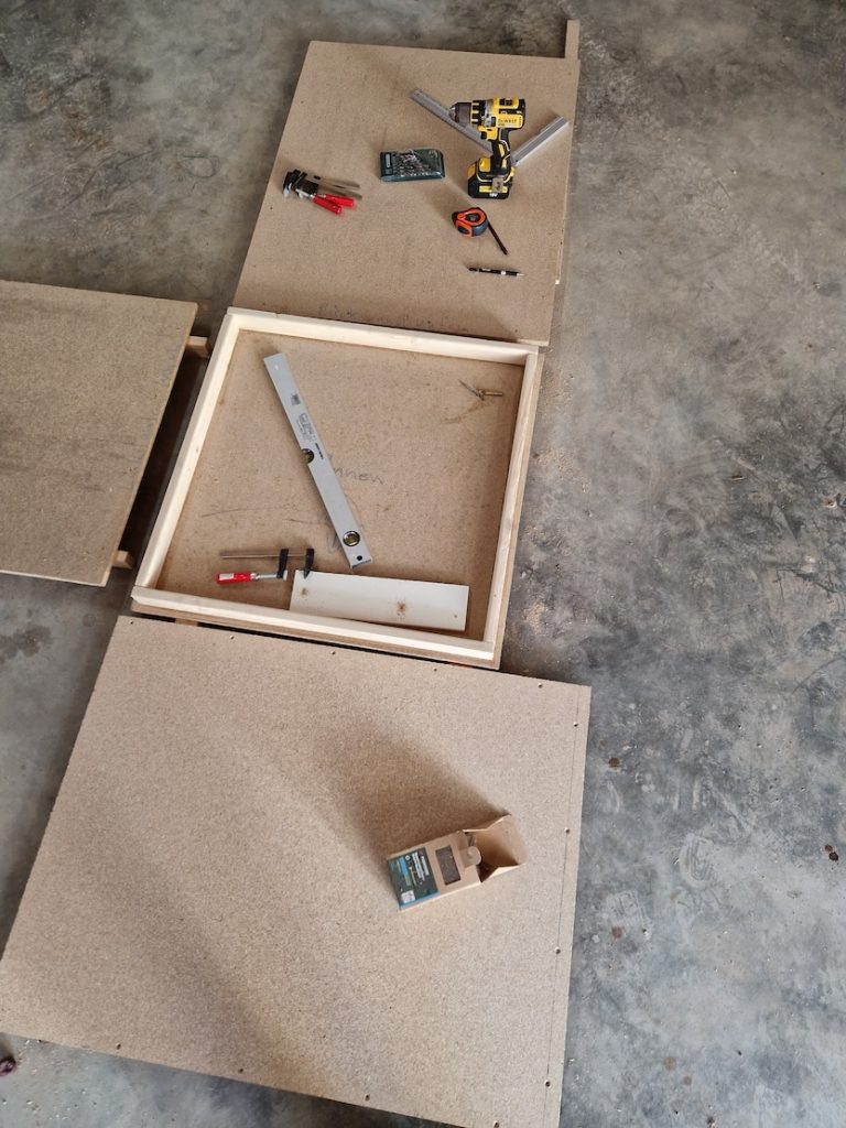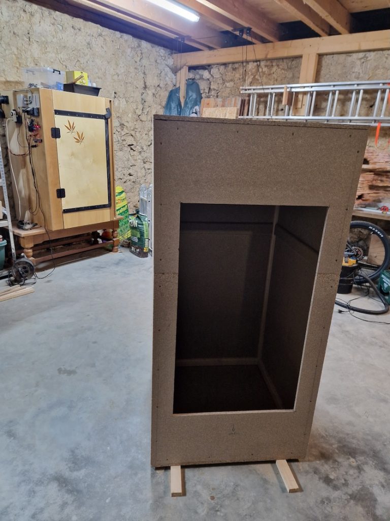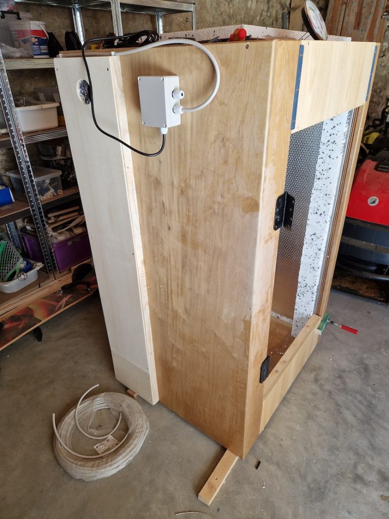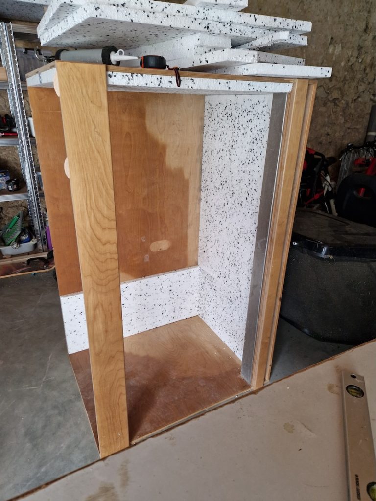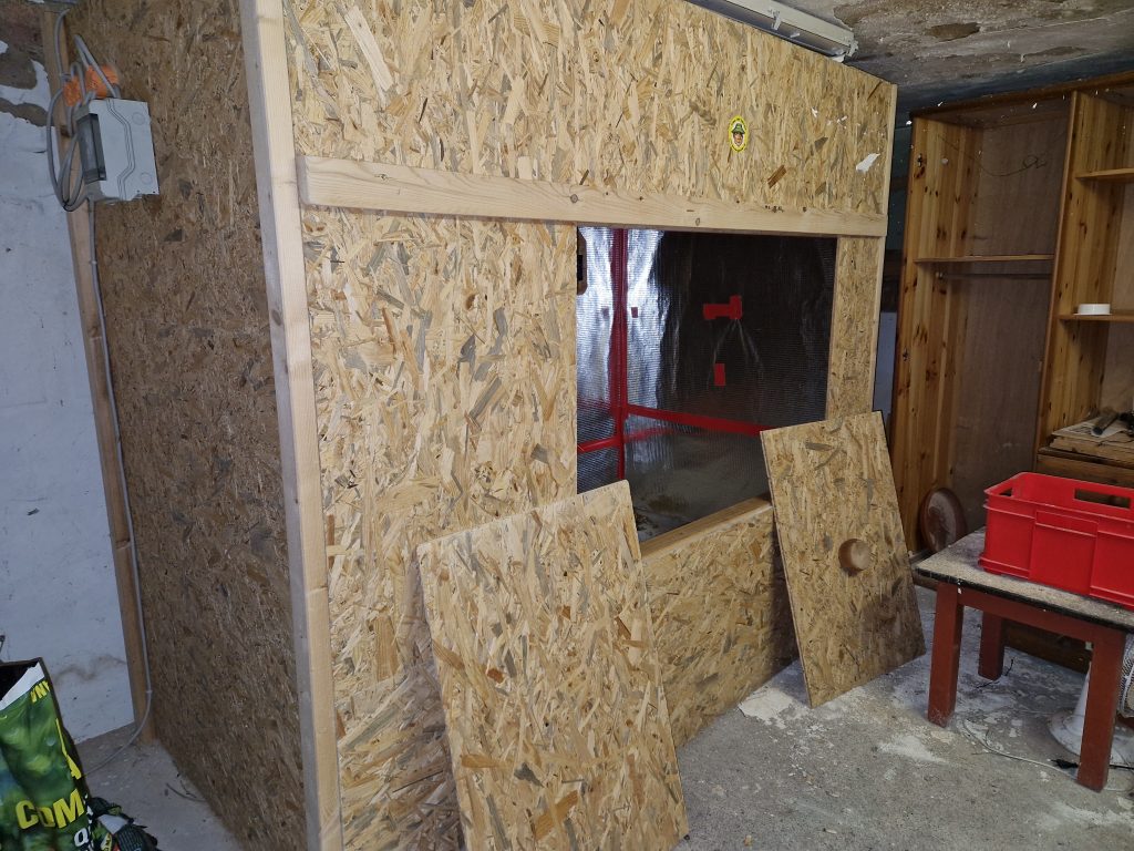 Sie misst 80 × 90 × 140 cm und ist vollständig mit Styropor sowie reflektierender Luftpolsterfolie isoliert.